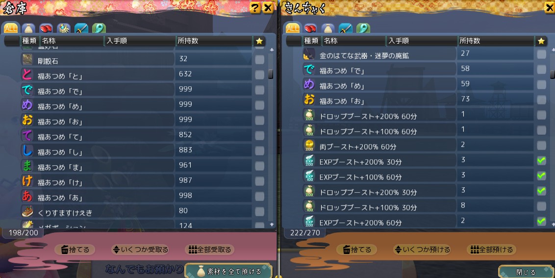 例えば、「あ」「け」「ま」「し」「て」が非常に集まりやすいと上で書きましたが、倉庫999+手持ち99で1098個の重箱を手に入れられるじゃないですか。