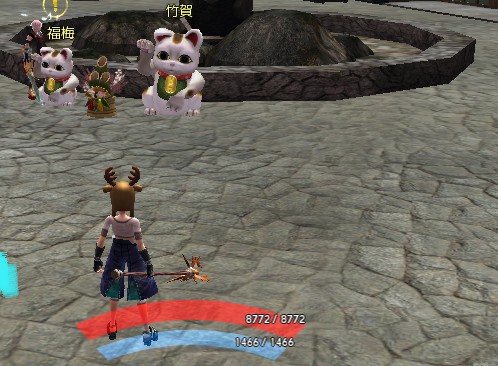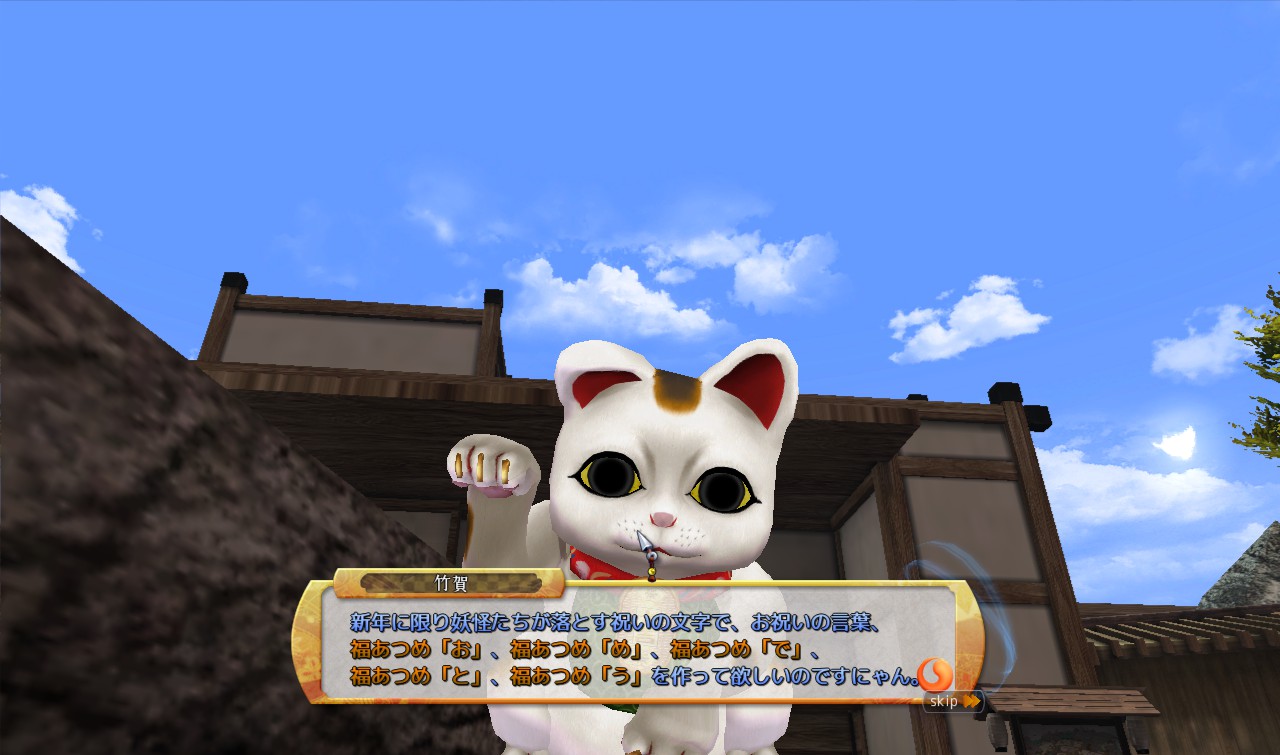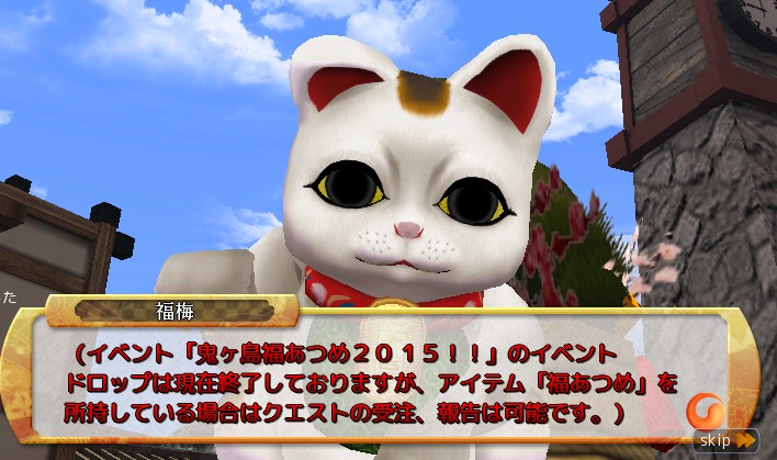 今回のイベントでは鬼ヶ島に現れた2匹の招き猫「竹賀」、「福梅」に話しかけることで特別なクエストを受け取ることが出来るようになっているのですが、その内容は敵を倒した時にドロップする「文字」を集めて持ってくるというもの。