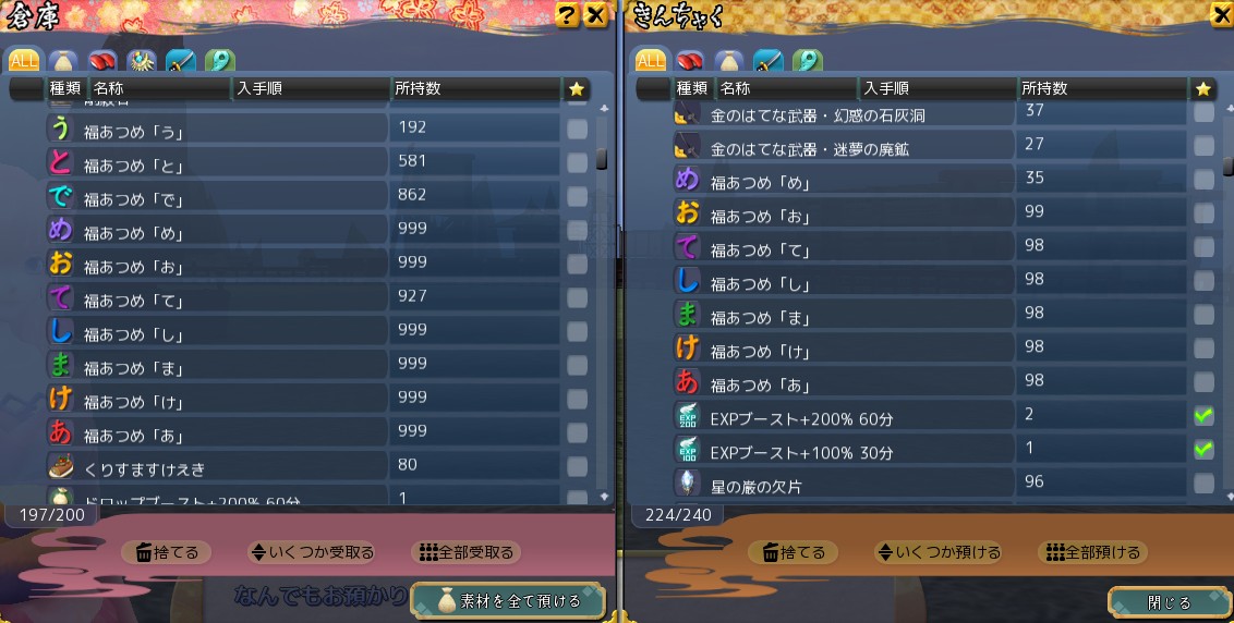 例えば、「あ」「け」「ま」「し」「て」が非常に集まりやすいと上で書きましたが、倉庫999+手持ち99で1098個の重箱を手に入れられるじゃないですか。
