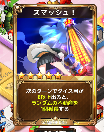 「ダイスコントロール」の発動率はダイスにもよりますが20~40%前後で、運が良ければ連続して狙ったマスに到着することも出来ます。