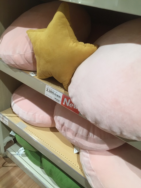ソラマチの向かい側のニトリ。ピンクの丸いクッションと星形のクッション、紛うことなきカービィ。